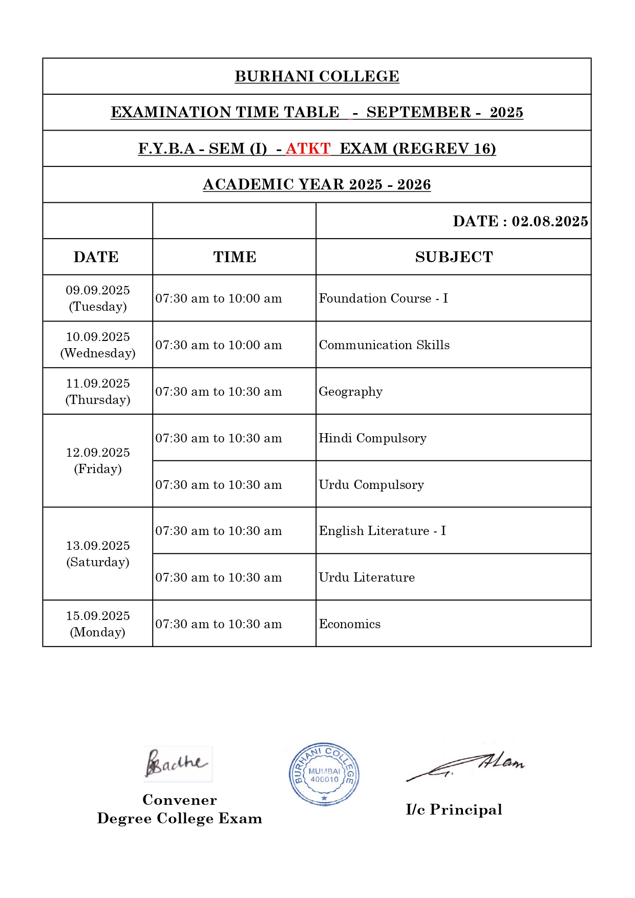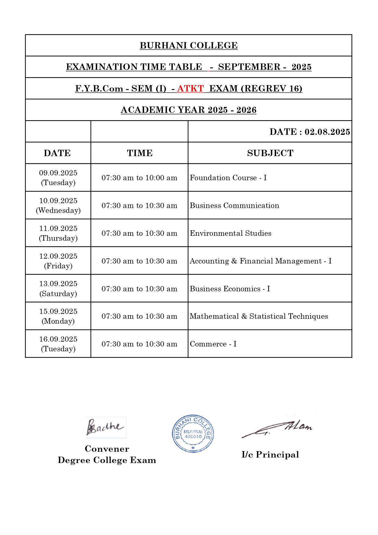 ATKT EXAM TIME TABLE SEM – I SEP – 2025