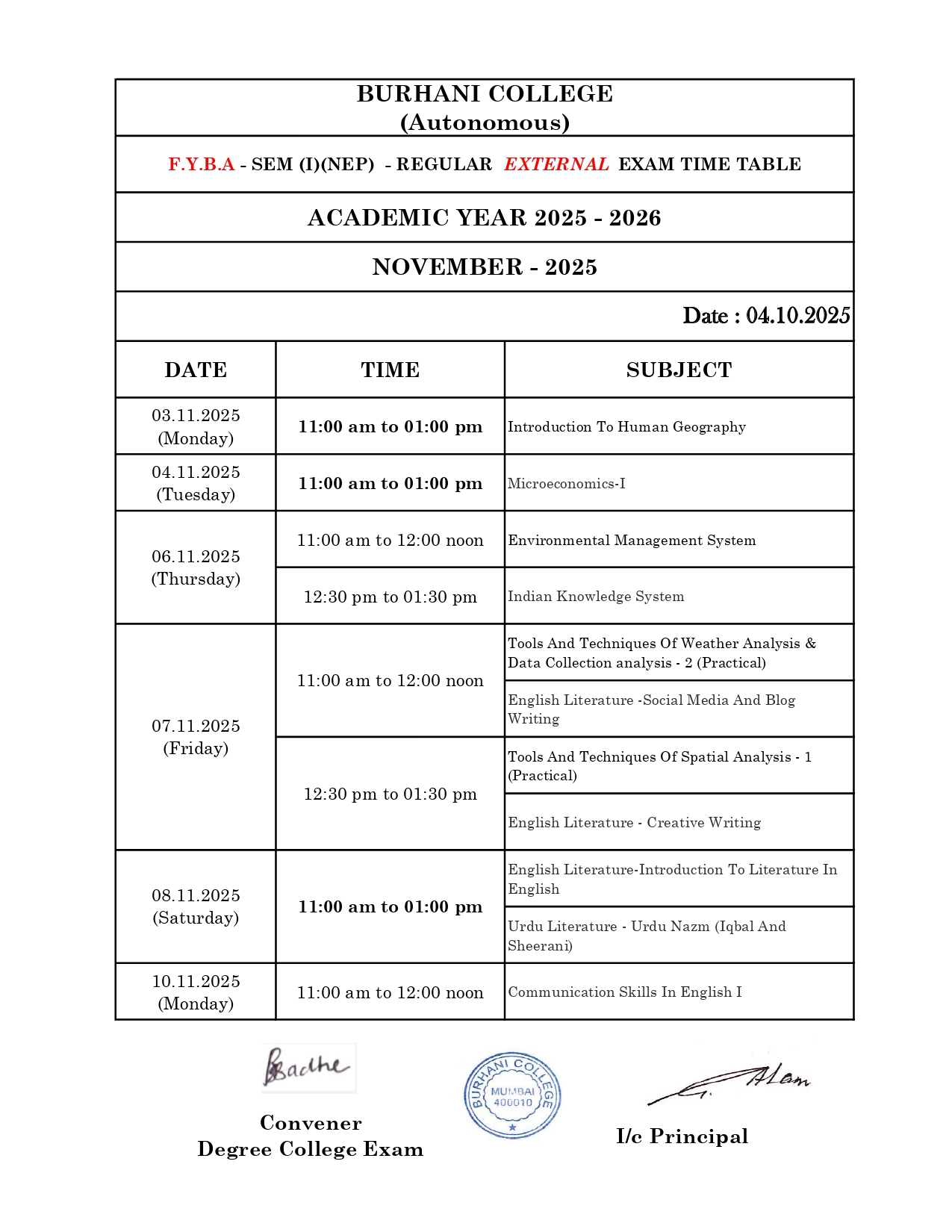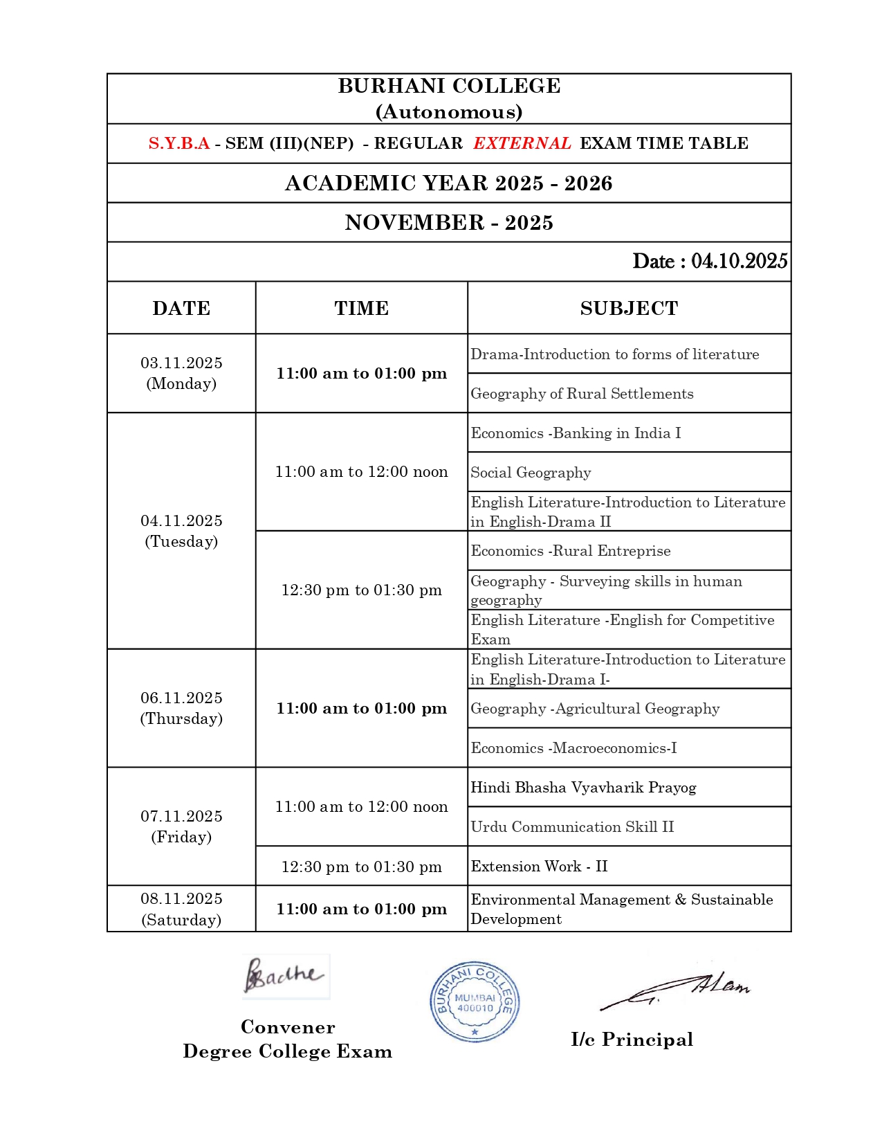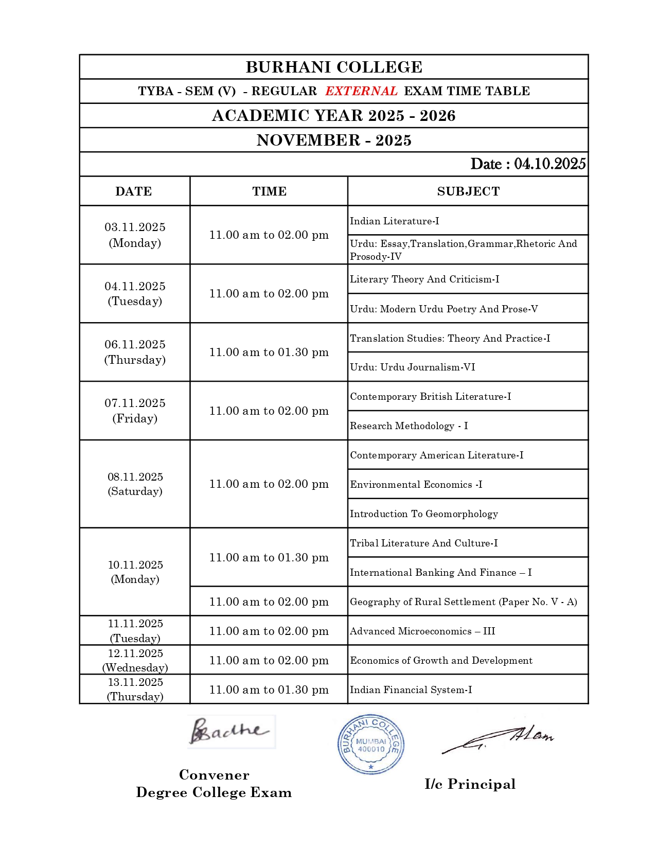 BA REGULAR EXTERNAL EXAM (SEM – I / III / V) TIME TABLE NOVEMBER – 2025