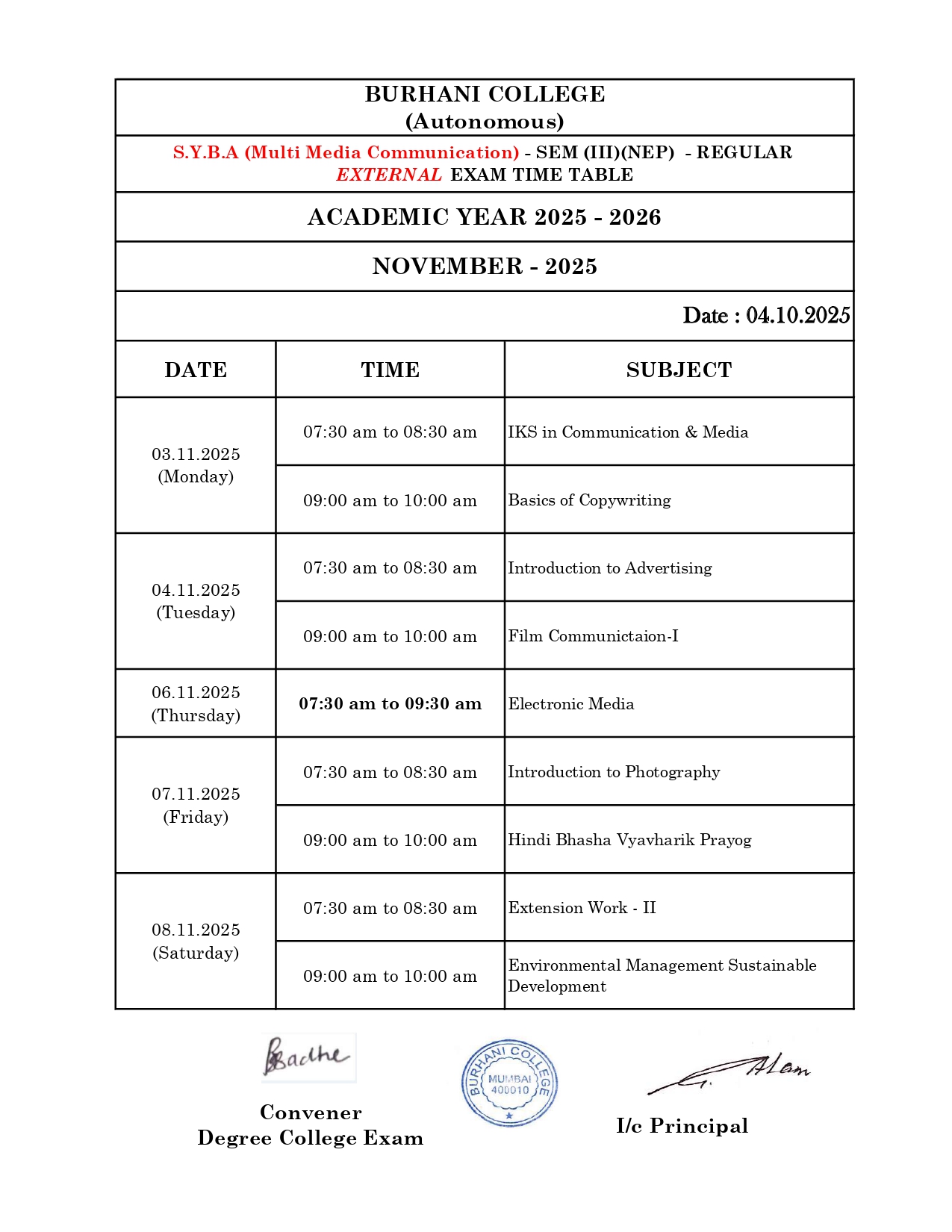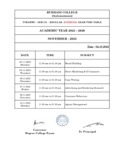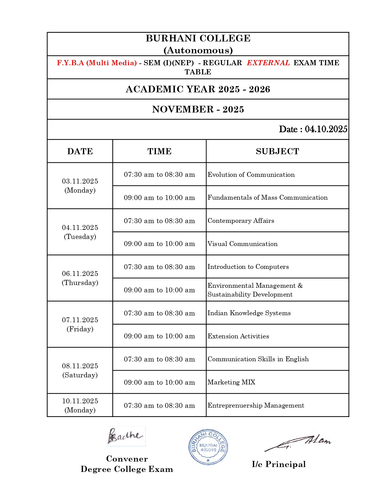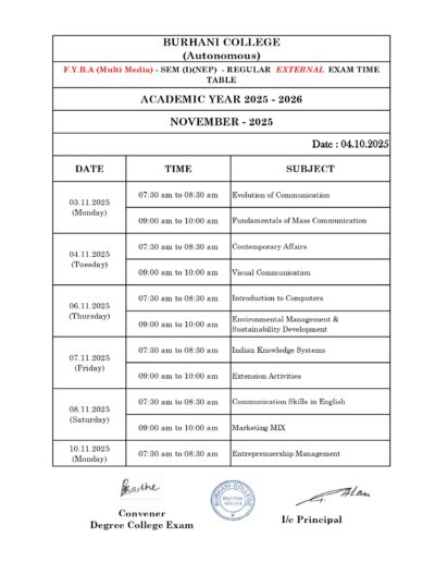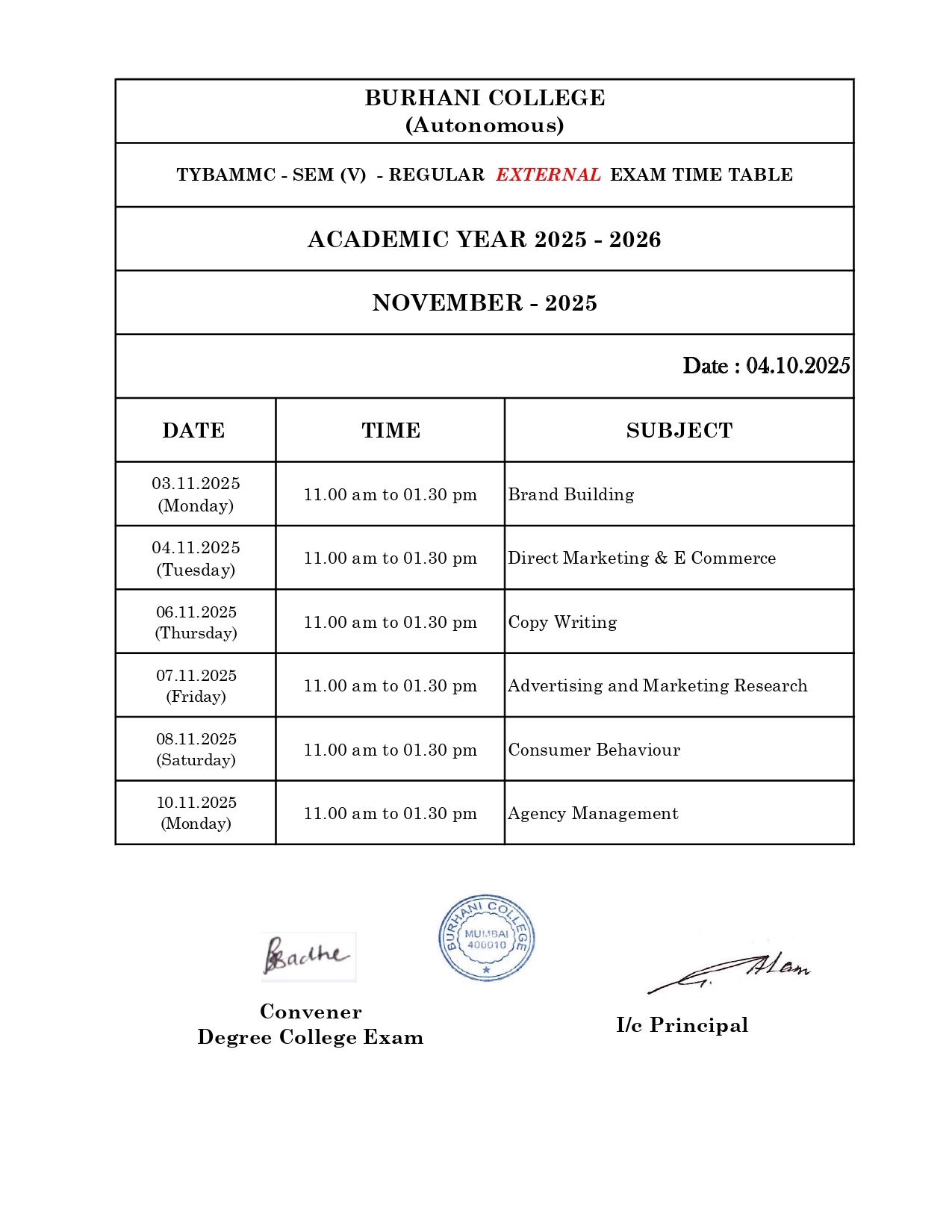 BAMMC REGULAR EXTERNAL EXAM (SEM – I / III / V) TIME TABLE NOVEMBER – 2025