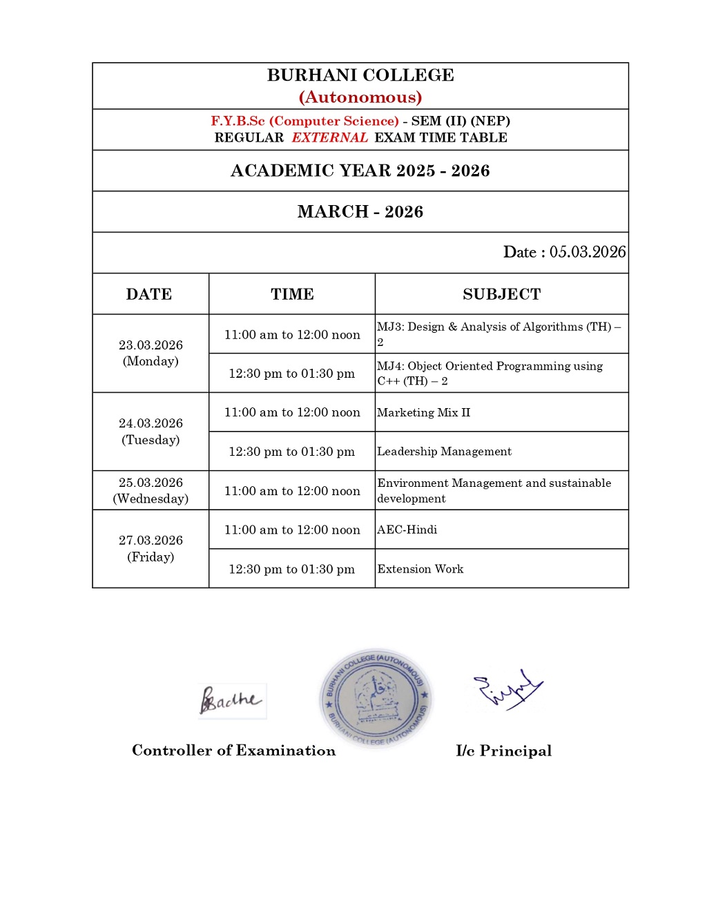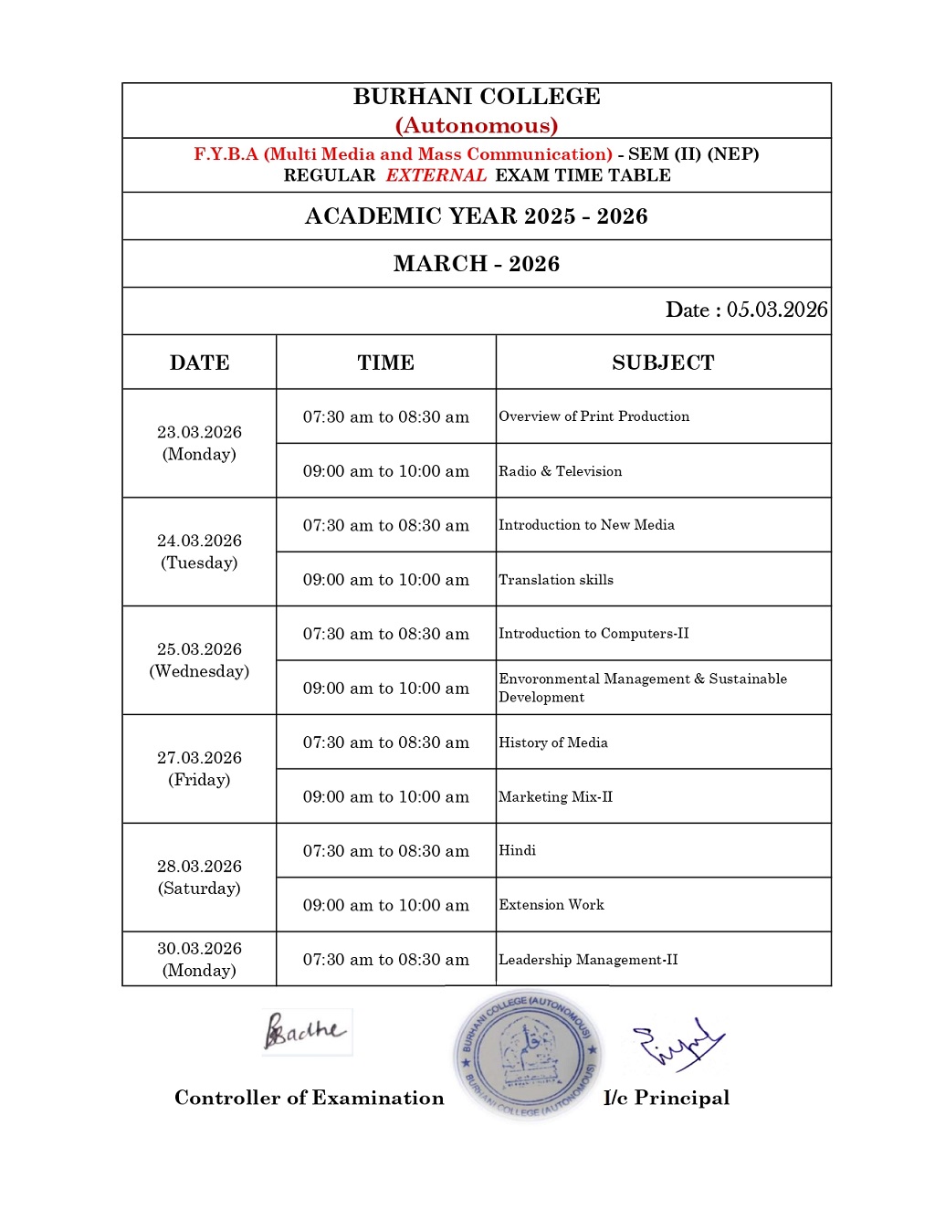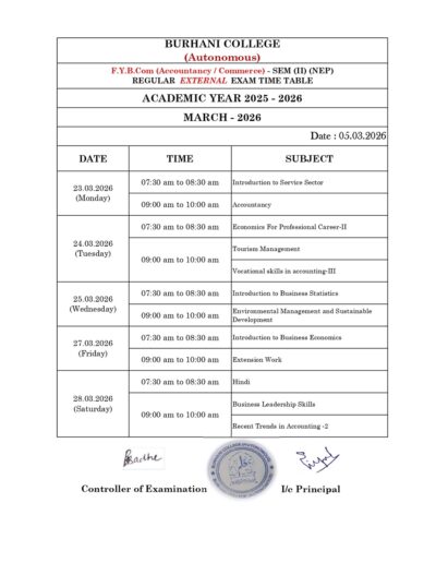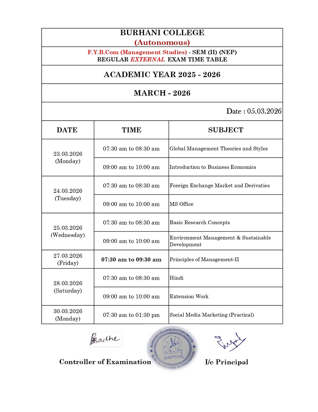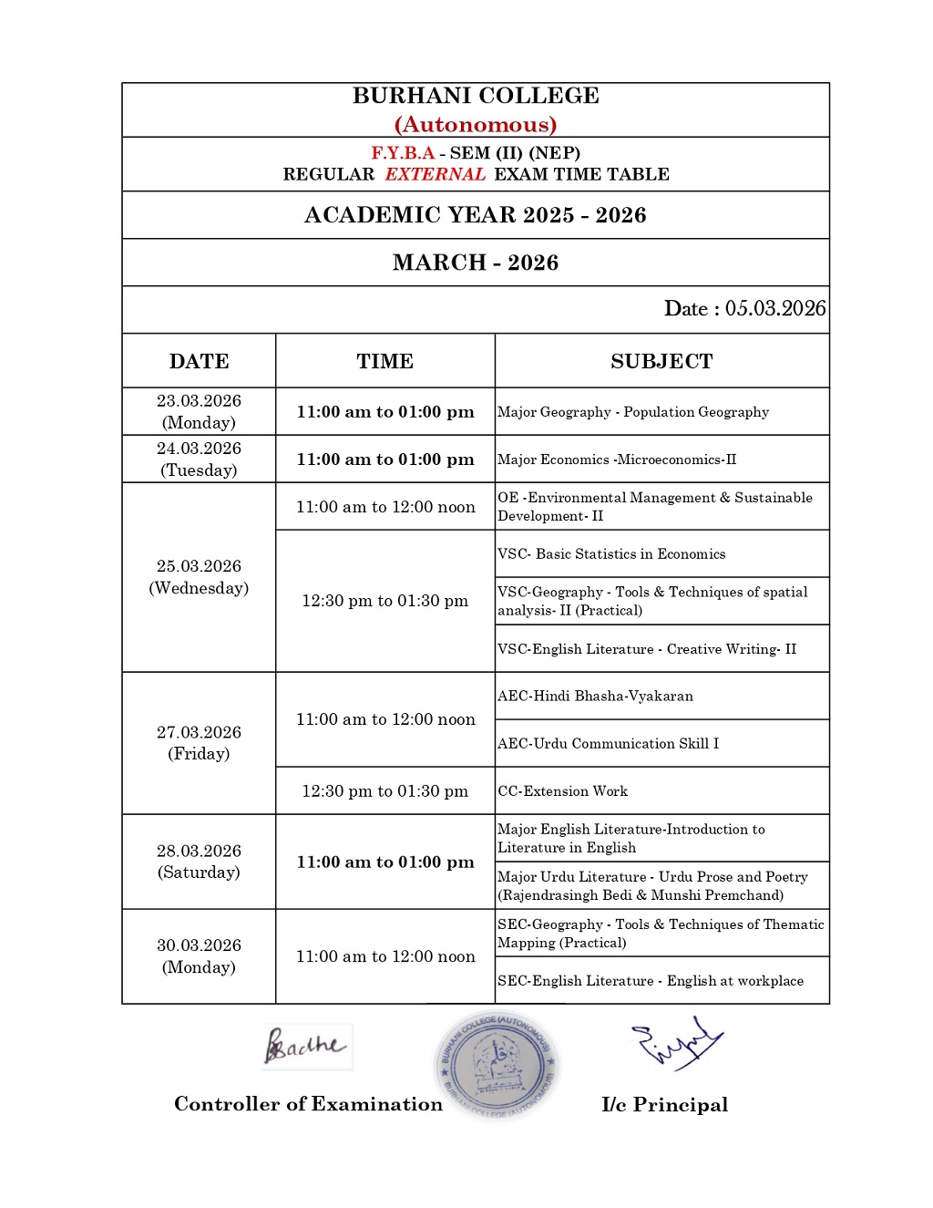 SEM – II REGULAR EXAM TIME TABLE MARCH – 2026