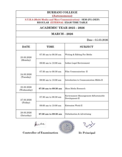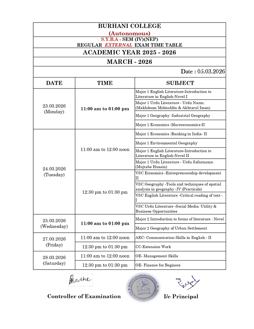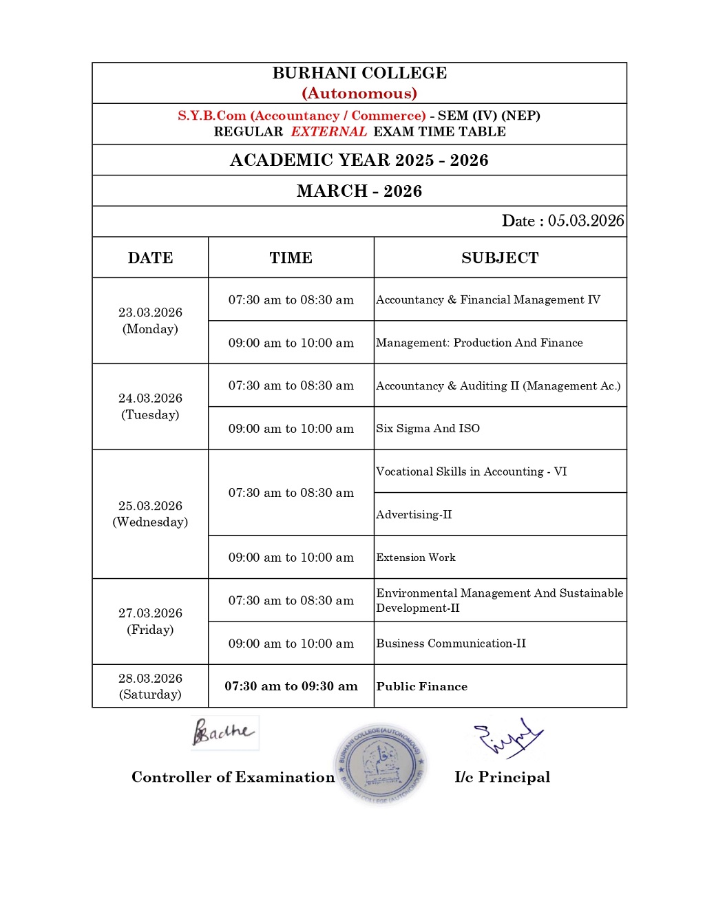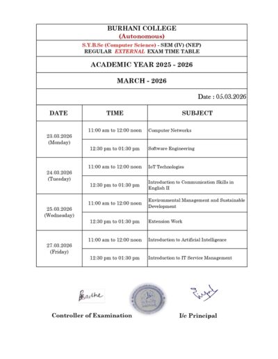 SEM – IV REGULAR EXAM TIME TABLE MARCH – 2026