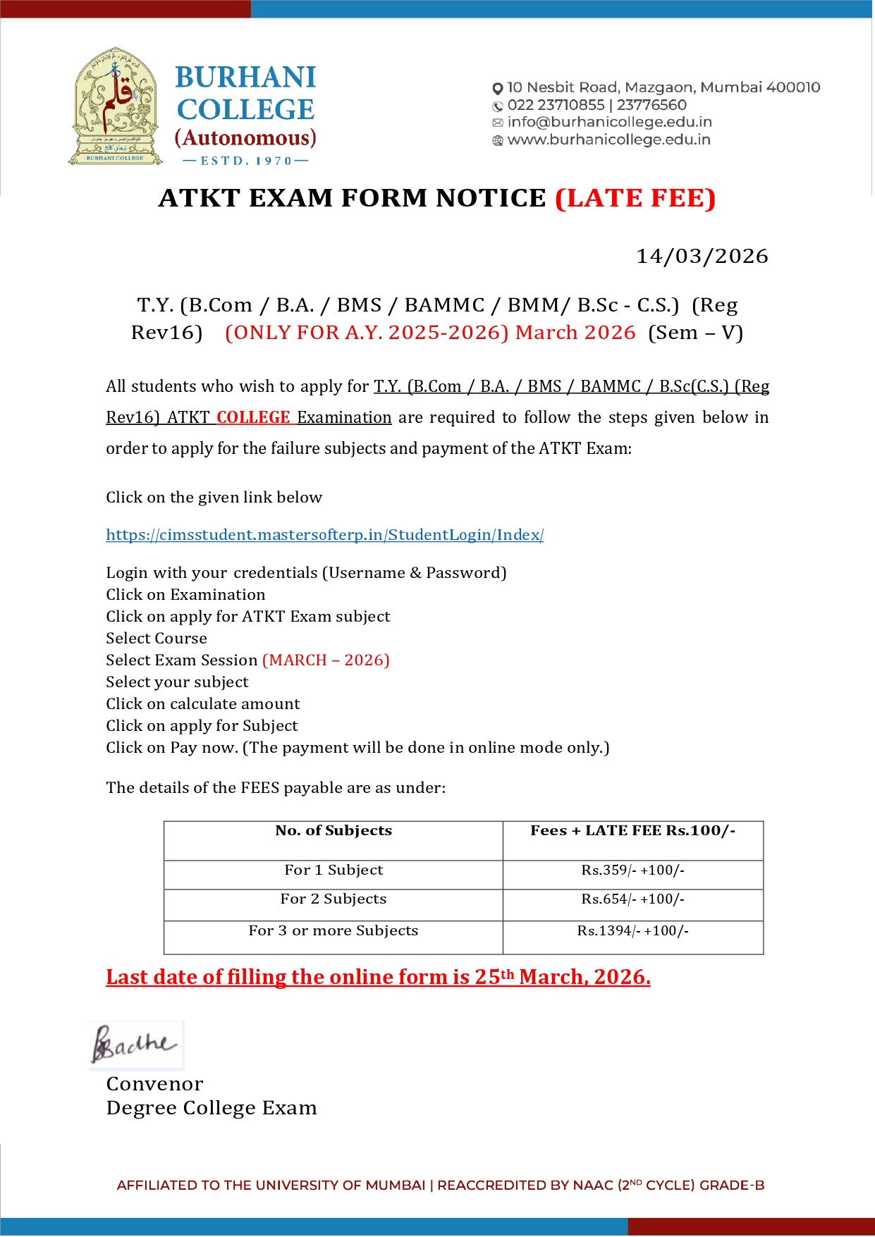 TY ATKT COLLEGE FORM LATE FEE FOR MARCH – 2025